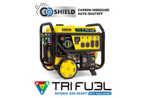 The Champion Tri Fuel Generator runs on Gasoline, Natural Gas, and Propane** for maximum flexibility. Up to 12.5 Hours run time on the 8.5 gallon gasoline tank and 5 hours on a 20-pound propane tank. The generator package includes a 25-foot Natural Gas hose and a 6-foot propane hose with built-in regulator. The 8000 Watt Champion Tri-Fuel Generator meets ANSI/PGMA G300-2018 requirements. CO Shield shuts down the generator if carbon monoxide reaches a dangerous level.