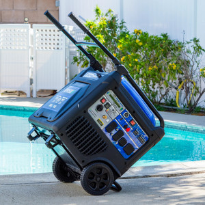 The DuroMax 9500 Watt Inverter Generator is a dual fuel portable with remote pushbutton electric start. It produces 9025 Watts and up to 9500 starting watts. The 61dB noise level equates to normal conversation. Two 8.5-inch wheels make moving and placement easy with the fold-down handle.