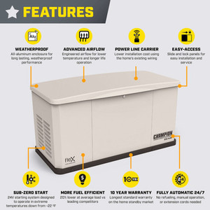 The Champion 22kW Standby Generator with FleX Technology powers your entire home through an outage, automatically, while decreasing costs and increasing efficiency. Enjoy the peace of mind provided by a home with electrical power throughout the longest outages. Peace of mind comes from the security of electrical power for all of your critical, essential, and convenient appliances and circuits.