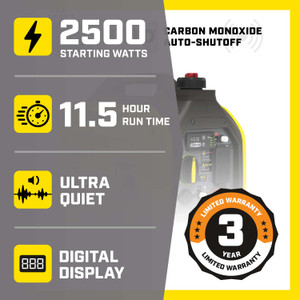 1850 Watts 2500 Starting Watts 53dBA 11.5-Hour Run Time 39.7 Pounds CO Shield