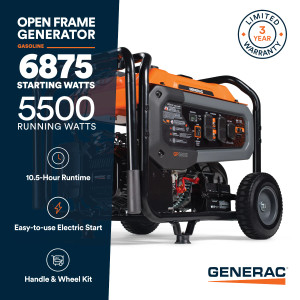 The Generac GP5500E is a 5500 Watt Generator with Electric Start and 50-State Emissions. COSense Technology automatically shuts down the generator in the presence of Carbon Monoxide. It features a fuel-efficient 289cc EFI engine that requires less maintenance. Electric start gets you up and running fast, and an hour meter helps track maintenance periods.