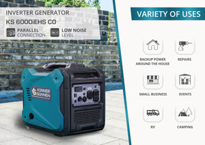 The KS 6000 iEHS 223 cc 4-stroke engine runs on gasoline or propane and produces up to 9 horsepower. The 5000 watt generator weighs 86.9 pounds and runs for up to 6.8 hours on the 2.9 gallon tank. Run time on propane varies according to propane tank size.