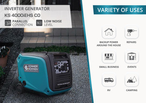 The Könner & Söhnen 4000 Watt Inverter Generator is an exceptionally quiet source of clean electrical power. With a pure sine wave output, the generator is safe to use with sensitive electronics, appliances, lighting, and tools. Rated for 3500 running watts and 4000 starting watts, output is approximately equivalent to a two standard 15-amp household circuits.
