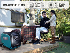 The KS 4000 iEHS 223 cc 4-stroke engine runs on gasoline or propane and produces up to 7.5 horsepower. The 4000 watt generator weighs 88 pounds. Enjoy up to 7.8 hours runtime on the 3.2 gallon tank. Run time on propane varies according to tank size.