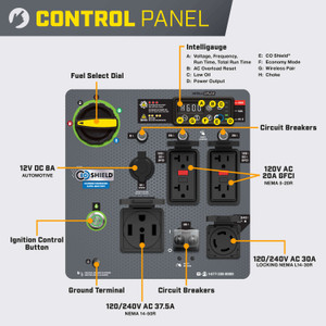 Champion's Quick-Touch Panel allows fast access to all controls like Intelligauge for Volts, Frequency, and Run Time plus Economy mode controls engine speed to reduce wear and improve fuel efficiency. AC overload and low oil shutdown protect the engine and generator from damage. Circuit breakers protect the 50-Amp, 30-Amp, and 20-Amp receptacles. A 12-volt automotive outlet for accessories or battery charging.