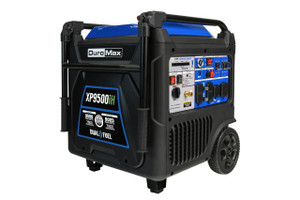 The DuroMax 9500 Watt Inverter Generator is a dual fuel portable with remote pushbutton electric start. It produces 9025 Watts and up to 9500 starting watts. The 61dB noise level equates to normal conversation. Two 8.5-inch wheels make moving and placement easy with the fold-down handle.