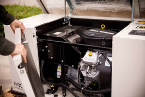 The generator's FleX controller handles all operations for the Champion 22kW Generator 201202. It has a light sensing OLED display and uses Power Line Carrier Technology to communicate with transfer switches and other components, eliminating wiring and installation costs. FleX Wi-Fi Direct allows your installer to set up the generator from a tablet or phone without a wired connection. It means less hassle for you, faster setup, and lower cost.