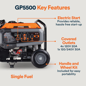 The Generac GP5500 Generator features electric start making it fast and easy to use. The 5.4-gallon steel tank with built-in gauge provides a run time of up to 10.5 hours at 50% rated load. Placement is easy with the locking folding handles and 9.5-inch never-flat wheels. The control panel provides 120-Volt and 120/240-Volt receptacle options.
