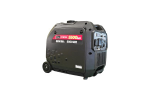 The Flex Power 5500 Watt Generator is an inverter generator with a variable speed engine to save fuel and reduce noise. With a telescoping handle and wheels for transport, the 76 pound 5500ies generator rolls to wherever you need it for easy placement. Electric start makes operation a breeze, with a recoil start cord for backup. A combination dial switch selects Run—Shut-Off—Flameout for quick setup and starts.